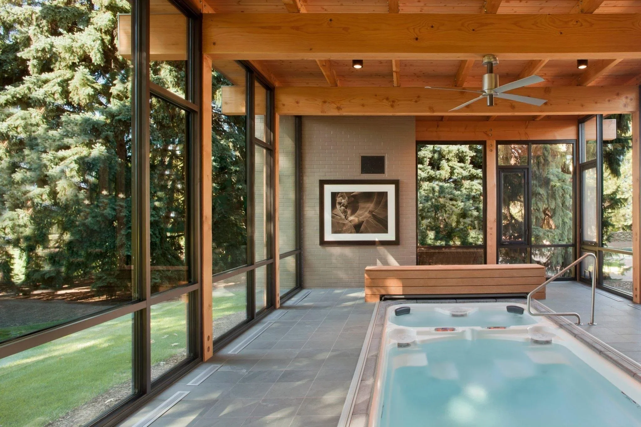 The structure showcases exposed timber beams and warm wood finishes, contrasted by sleek stone flooring and modern fixtures for a refined yet grounded aesthetic. At its center, a swim spa is thoughtfully integrated for both relaxation and fitness, framed by minimalist lines and high-end detailing. A bespoke wood bench and a curated art piece add a layer of personal sophistication, making this pool house not just an escape—but an experience.